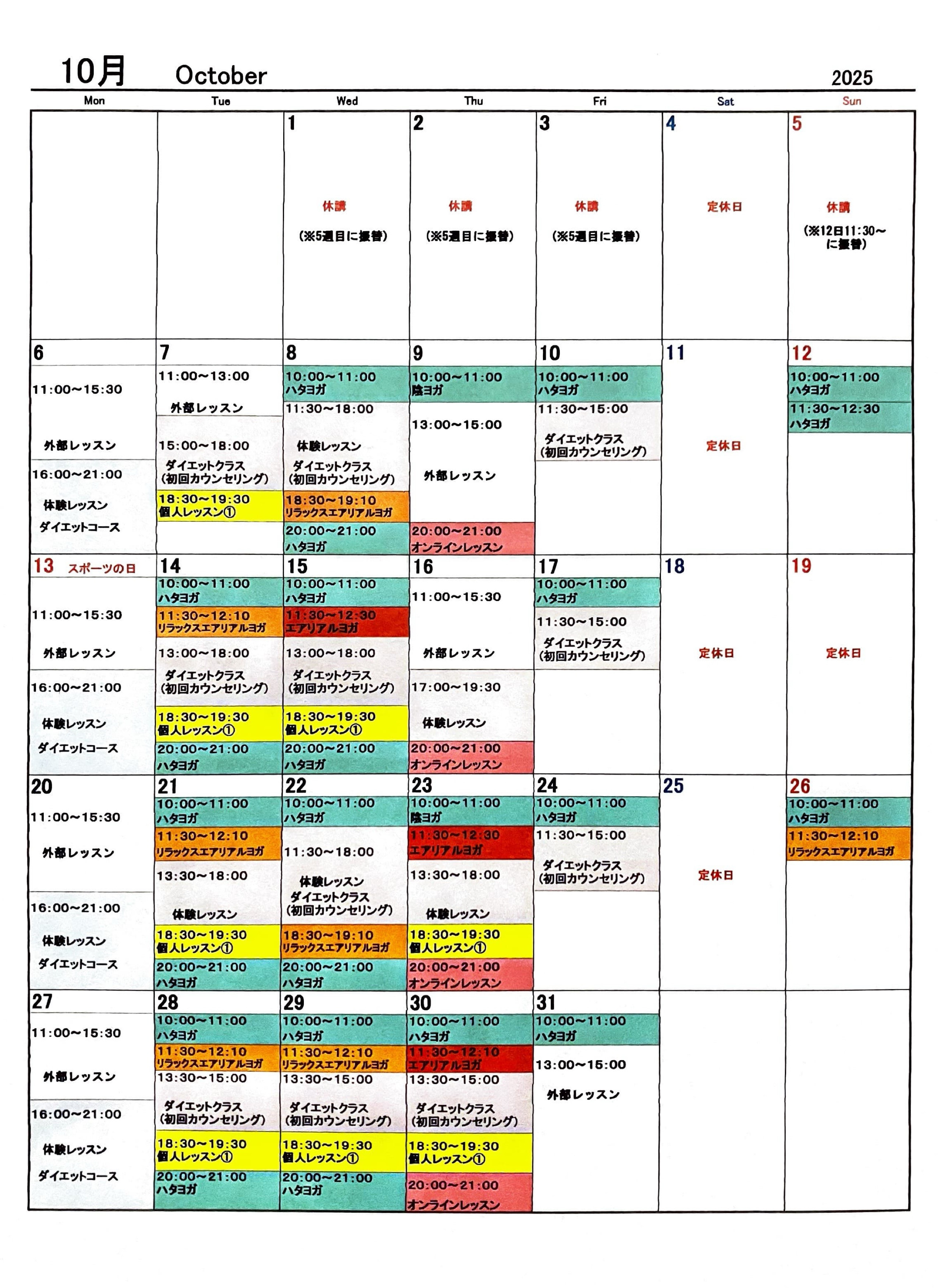 ※体験レッスンは、「ハタヨガ」既存クラスでの体験レッスンが60分、「体験レッスン」と記載された時間帯での体験レッスンは40分です。